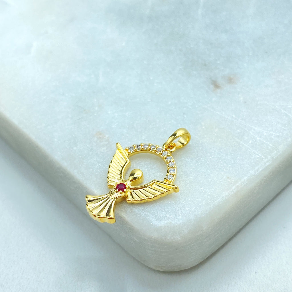 18k Gold Filled Angel Charm, CZ Halo Pendant with Red CZ Stone, Dainty Religious Jewelry, Faith Gift, CZ Angel Charm