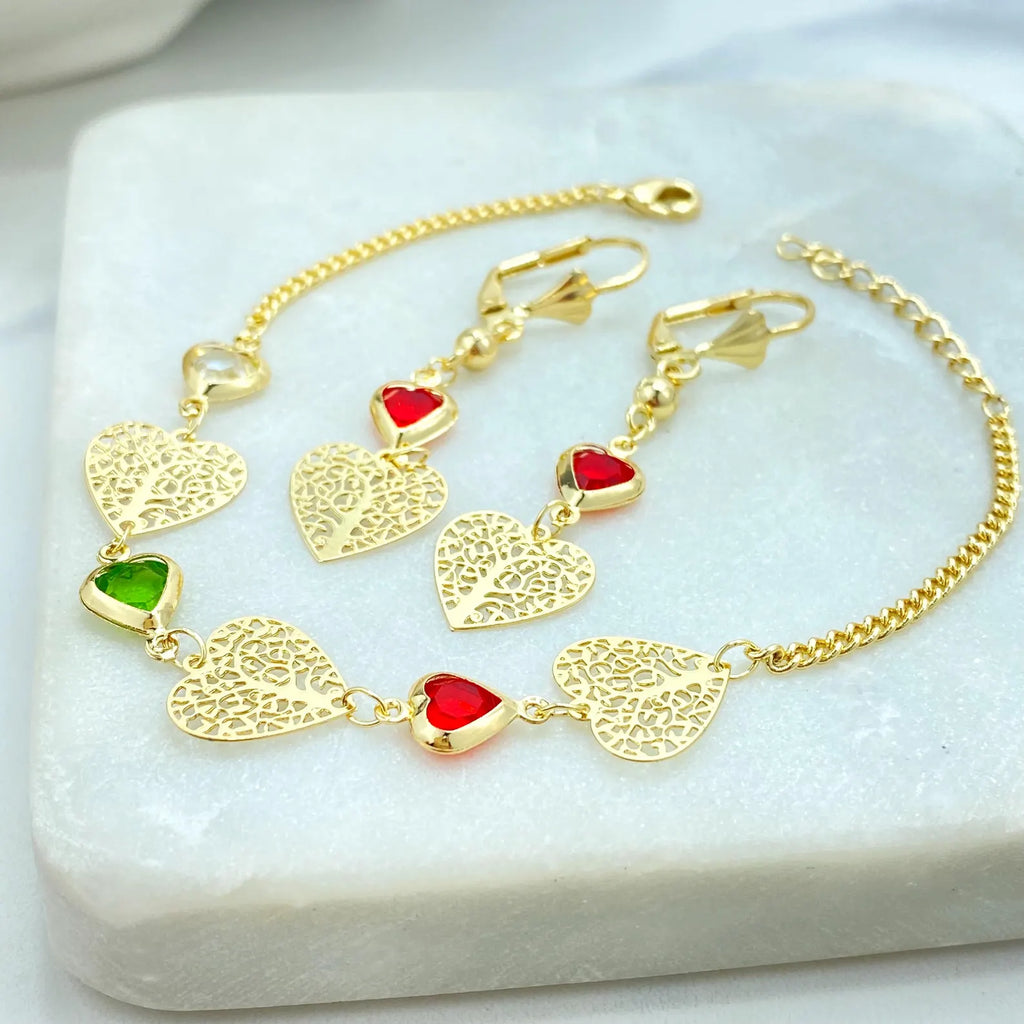 18k Gold Filled Filigree Heart Jewelry Set, Colorful Heart Necklace, Bracelet & Earrings, Romantic Wholesale Jewelry