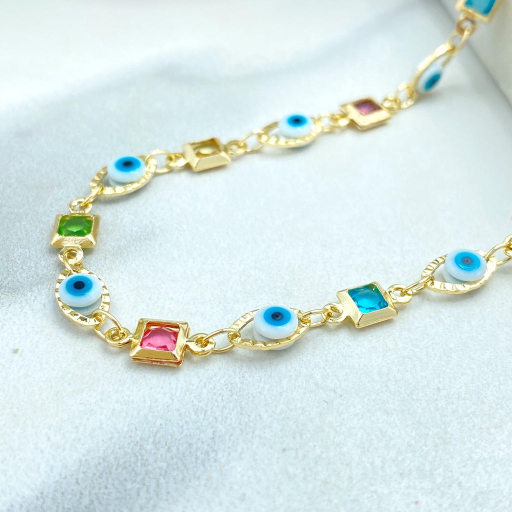 18k Gold Filled Evil Eye Jewelry Set, Multicolor CZ Stones Necklace, Bracelet & Earrings, Wholesale Jewelry
