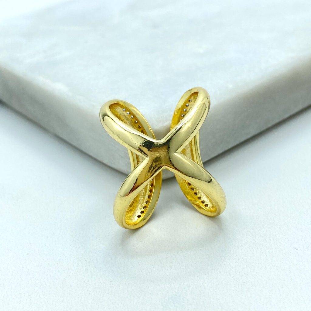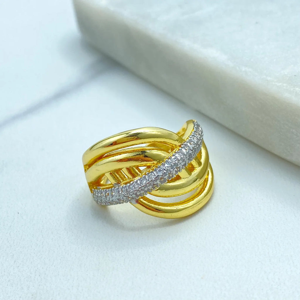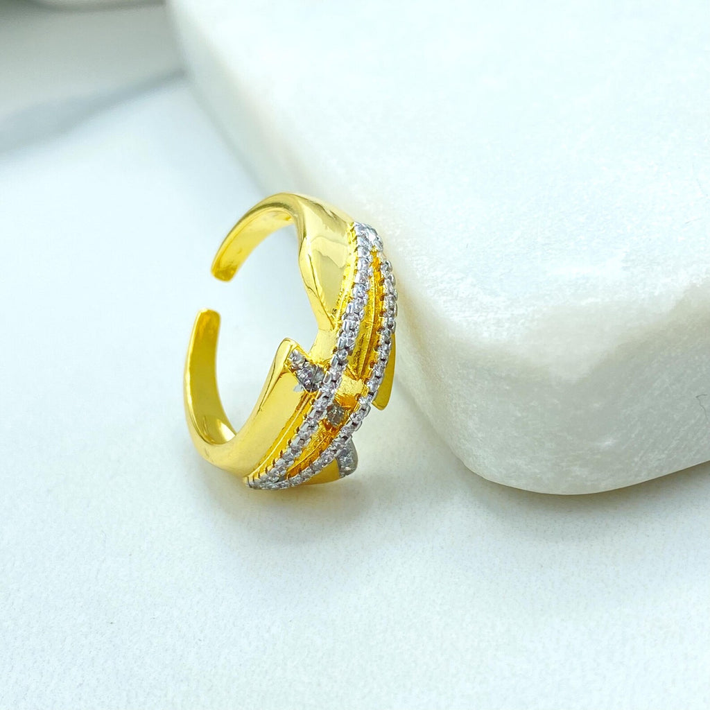 Gold Plated Adjustable Crossed CZ Ring, Elegant Double Row Design, Open Band, Wholesale Jewelry