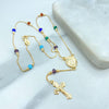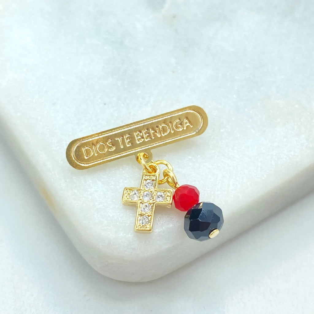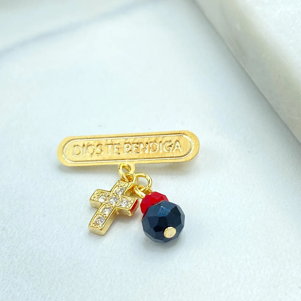 18k Gold Filled “Dios Te Bendiga” Safety Pin Brooch, Cross & Beads Charm Pin