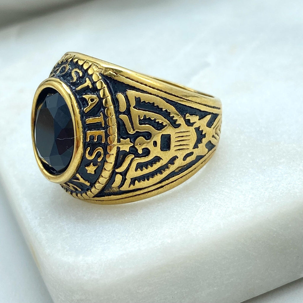 Gold Stainless Steel Men’s Ring with Black Stone – Vintage United States Eagle Military Design