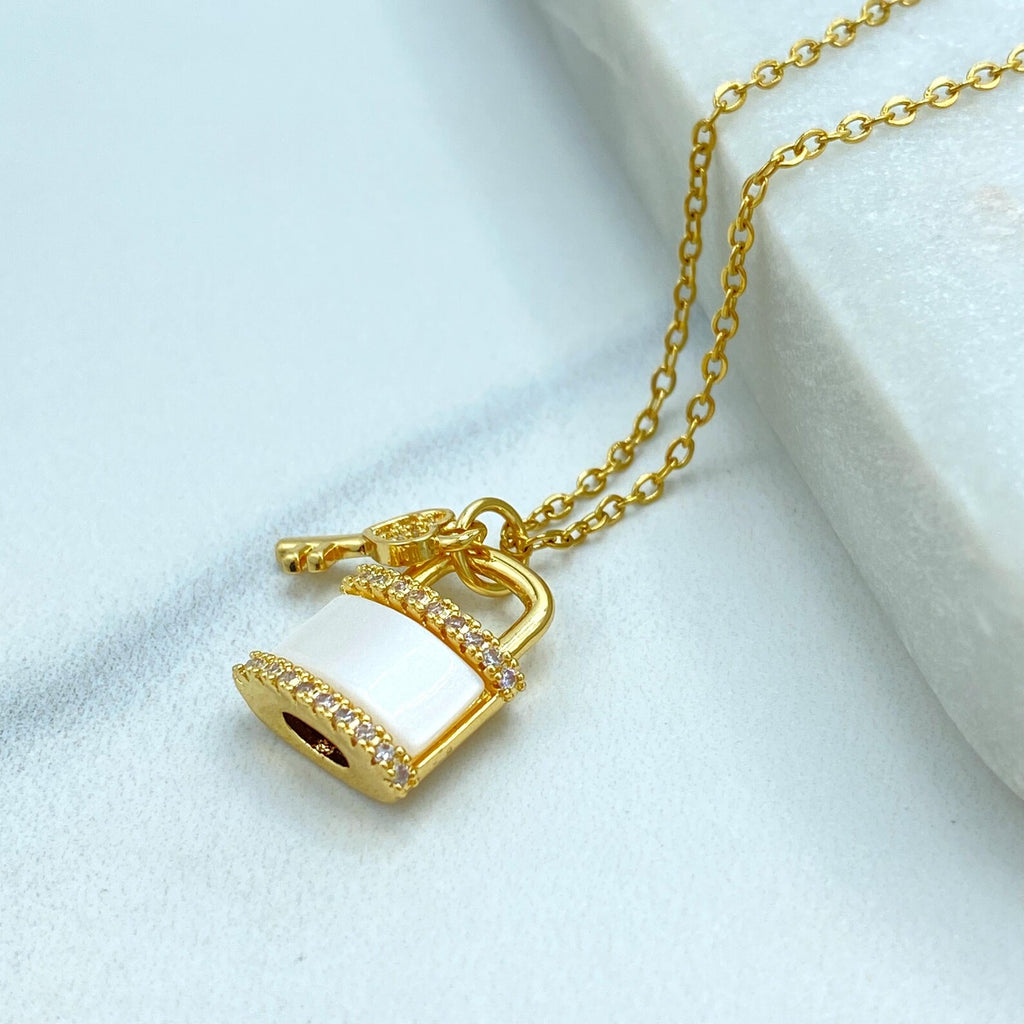Stainless Steel CZ Lock and Key Necklace, Gold Plated Padlock Pendant with Mother of Pearl Detail, Wholesale Jewelry