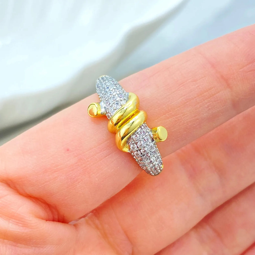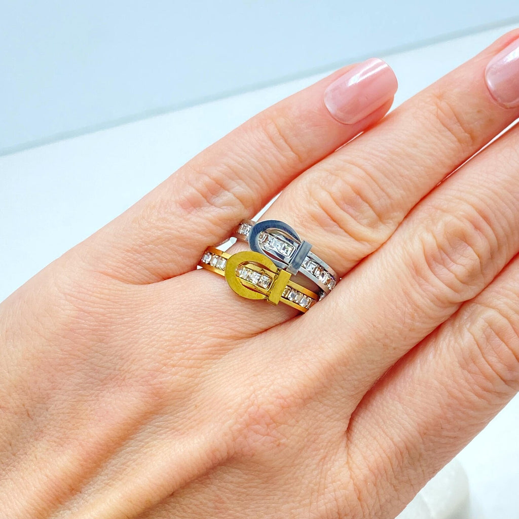 Stainless Steel Belt Design Ring, Silver and Gold Finish, CZ Stone Detail, Modern Ring, Wholesale Jewelry