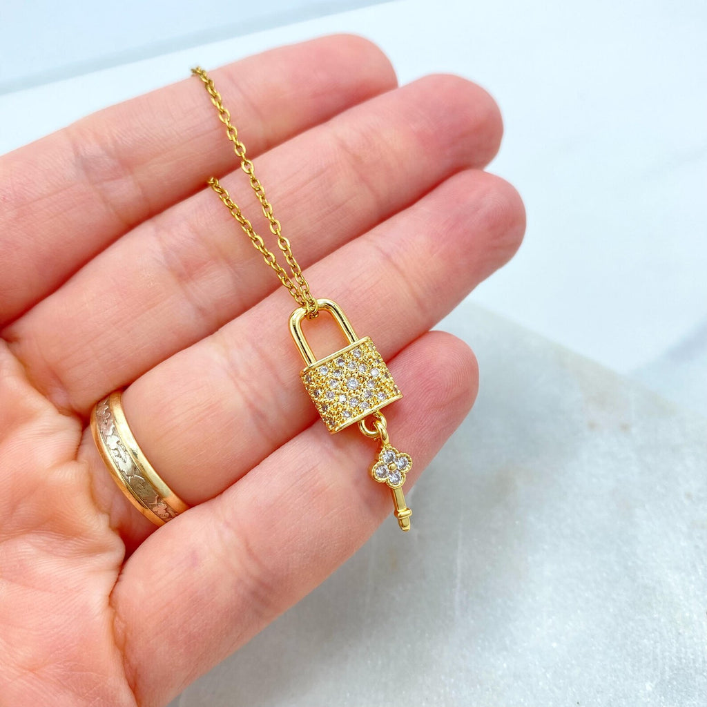 Stainless Steel Lock and Key Necklace, CZ Pave Padlock Pendant, Gold Chain Necklace, Dainty Statement Jewelry
