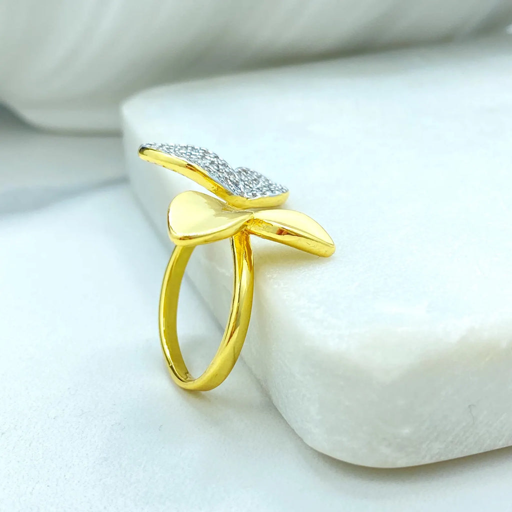 Gold Plated Adjustable Butterfly Leaf Ring, Dual-Tone CZ Pavé Design, Wholesale Jewelry