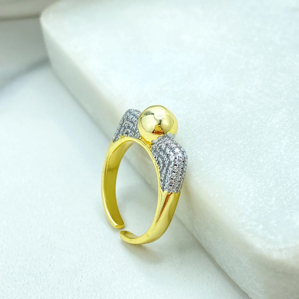 Gold Plated Adjustable Sphere Ring, CZ Pavé Side Detailing, Modern Open Band, Wholesale Jewelry