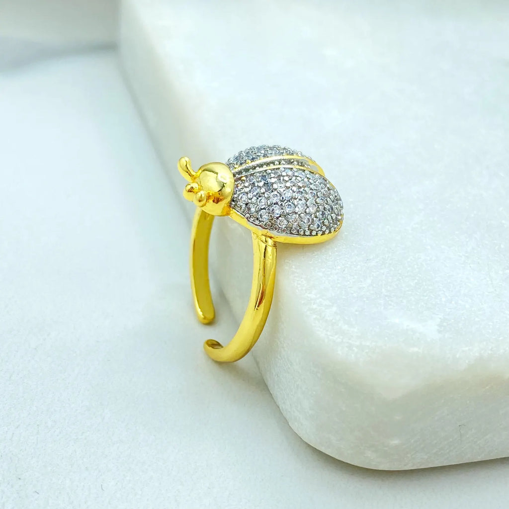 Gold Plated Adjustable Ladybug Ring, CZ Pavé Insect Design, Cute & Elegant Open Band, Wholesale Jewelry
