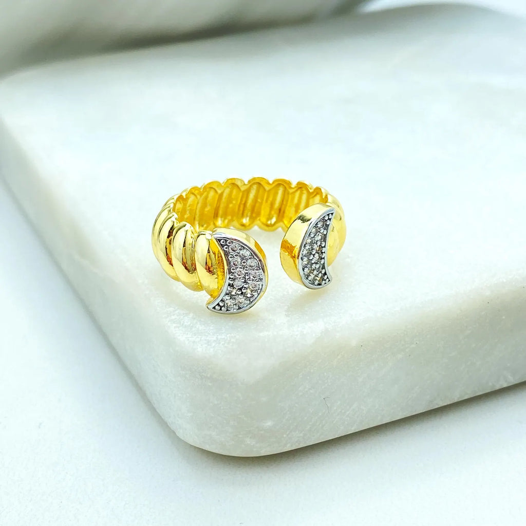 Gold Plated Adjustable Crescent Ring, CZ Pavé Moon Design, Textured Open Band, Wholesale Jewelry