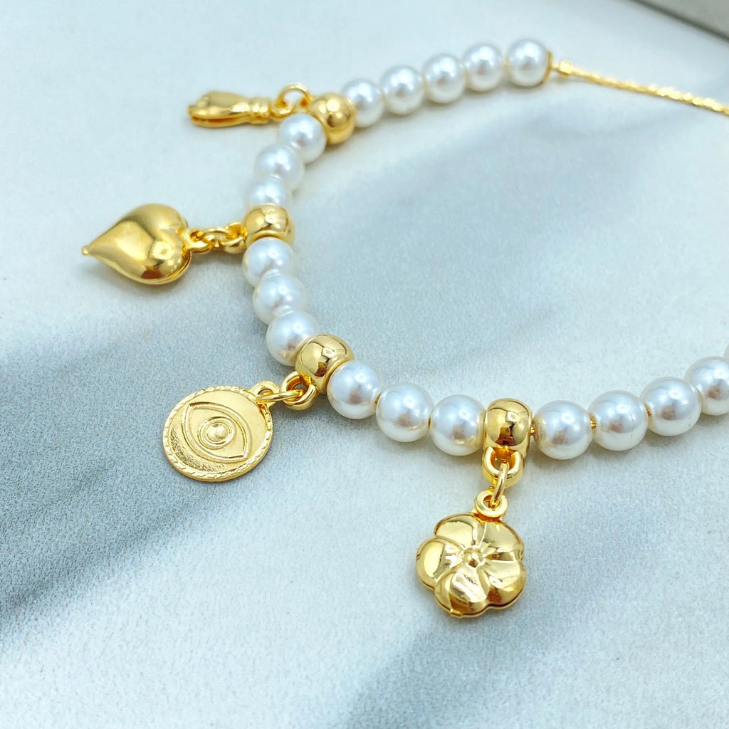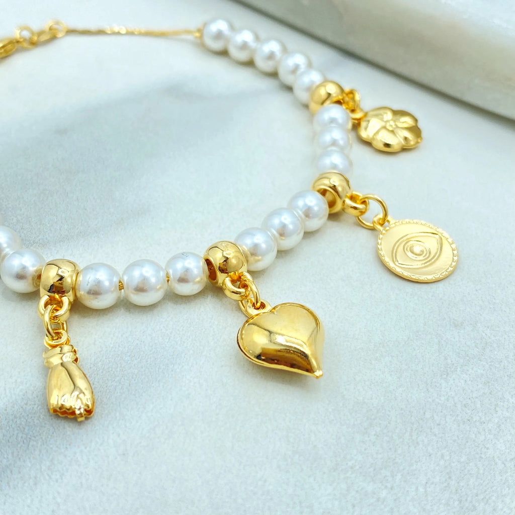 18k Gold Filled Bracelet, Simulated Pearls with Lucky Charms, Protection and Heart Charms, Lucky & Protection Bracelet