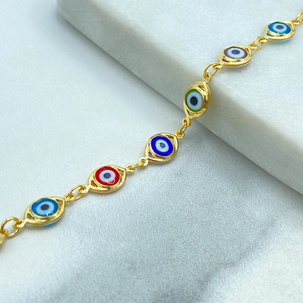 18k Gold Filled Linked Multi-Color Evil Eye Bracelet, Colorful Protection Jewelry, Rainbow Nazar Bracelet