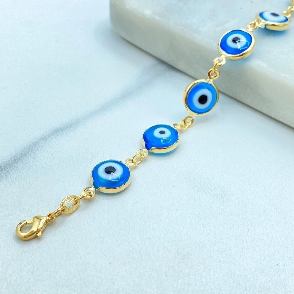 18k Gold Filled Linked Evil Eye Bracelet, Blue Protection Eyes, Gold Chain Bracelet, Turkish Nazar Jewelry