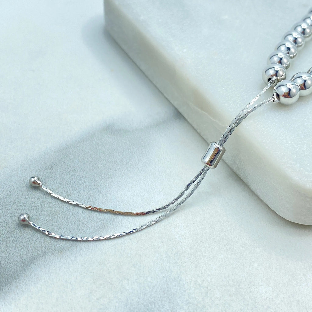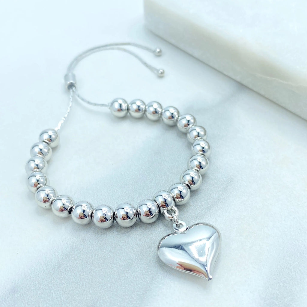 Silver Filled Adjustable Beaded Bracelet, Puff Heart Charm Bracelet, Polished Ball Beads, Friendship Bracelet
