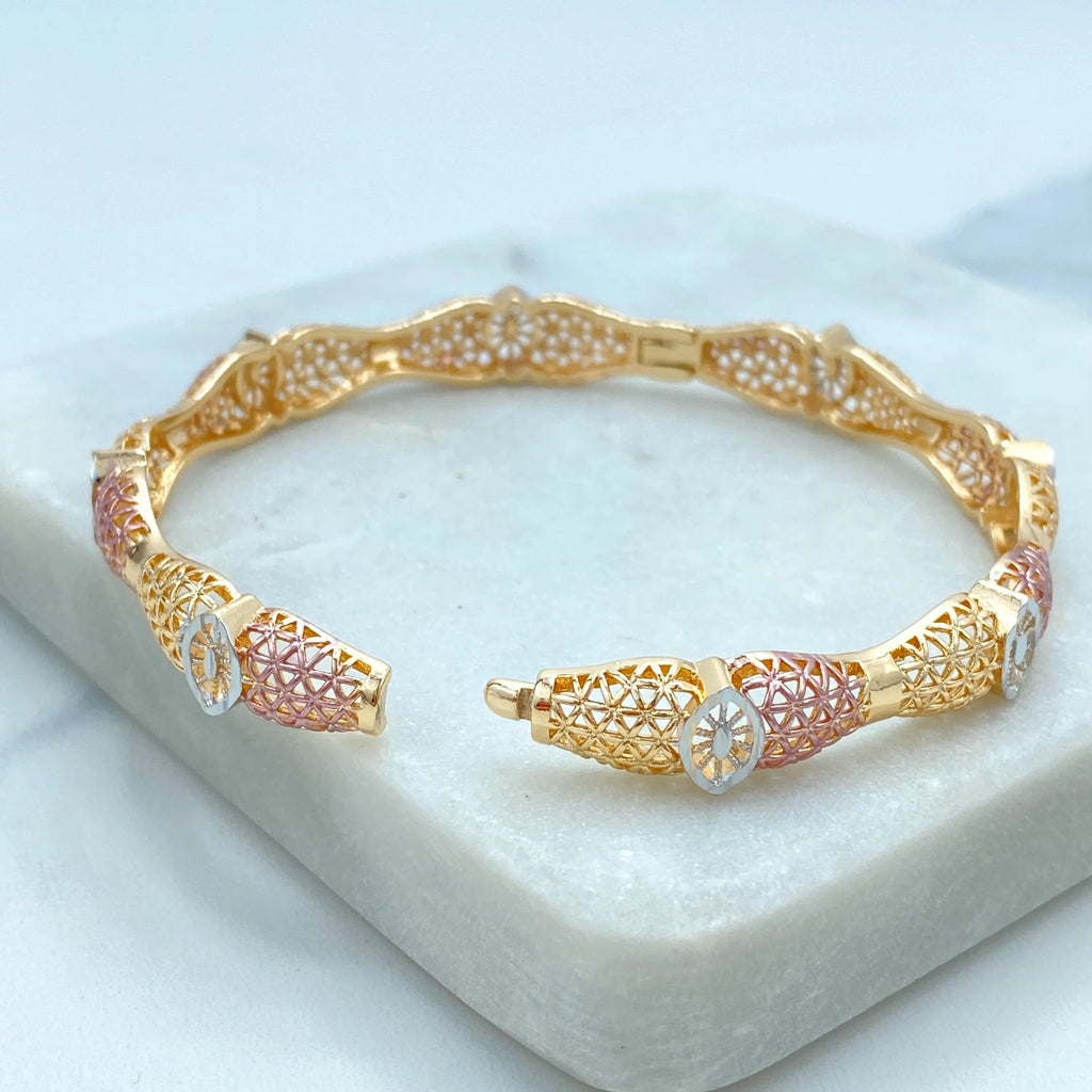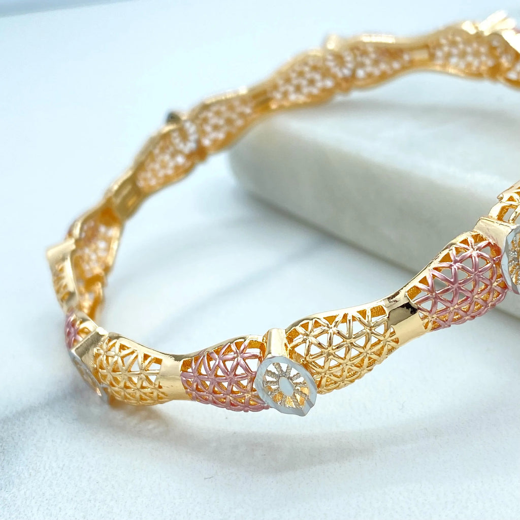 18k Gold Filled Tri-Tone Bangle, Lattice Pattern Bracelet, Elegant Statement Jewelry, Rose Gold Accents
