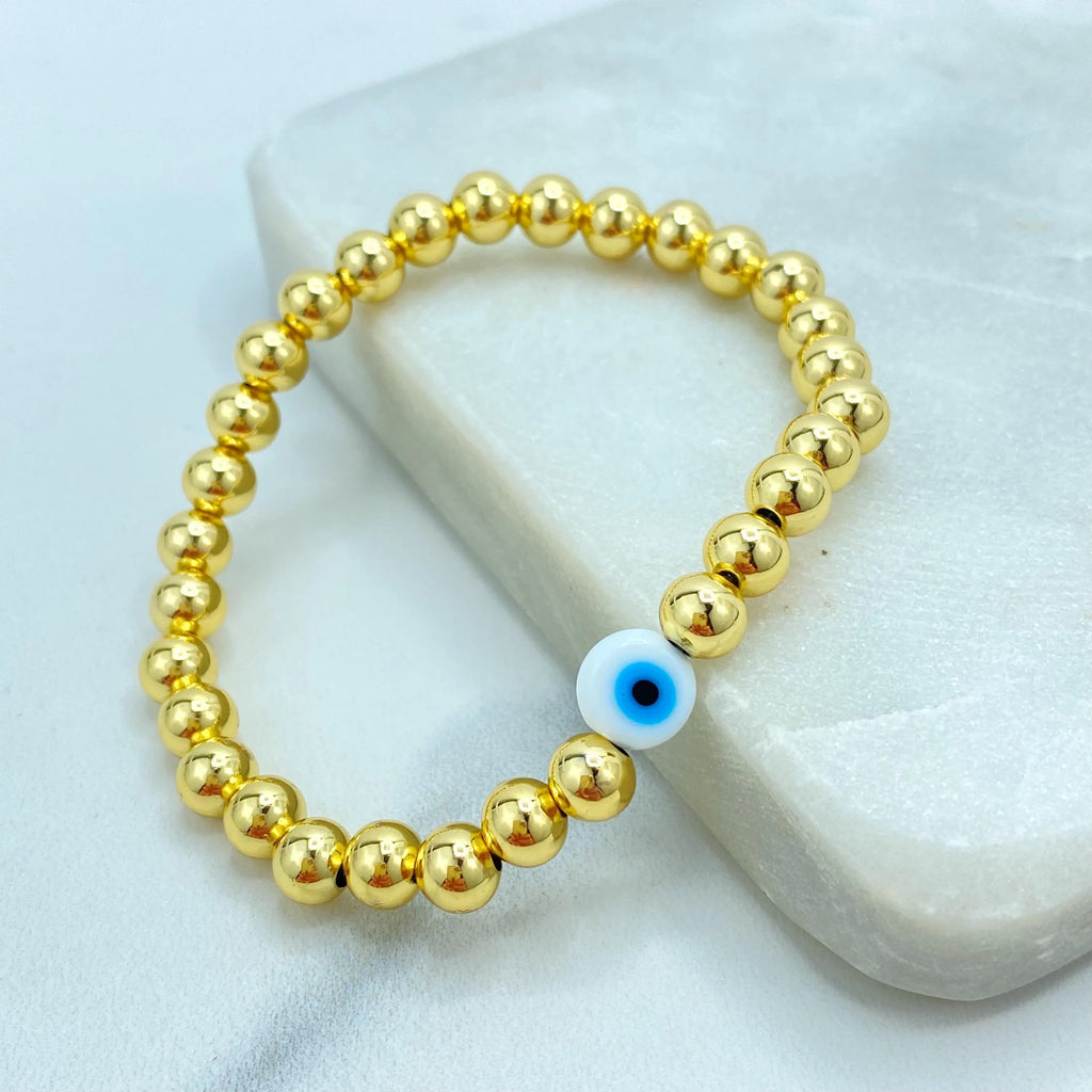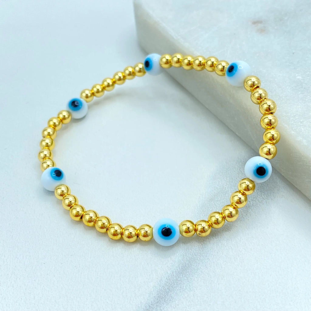 18k Gold Filled Evil Eye Beaded Bracelets, Stretch Protection Bracelets, Two Styles – Small & Medium Beads, Blue Eye Jewelry