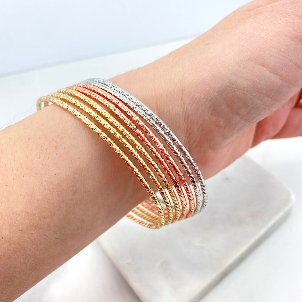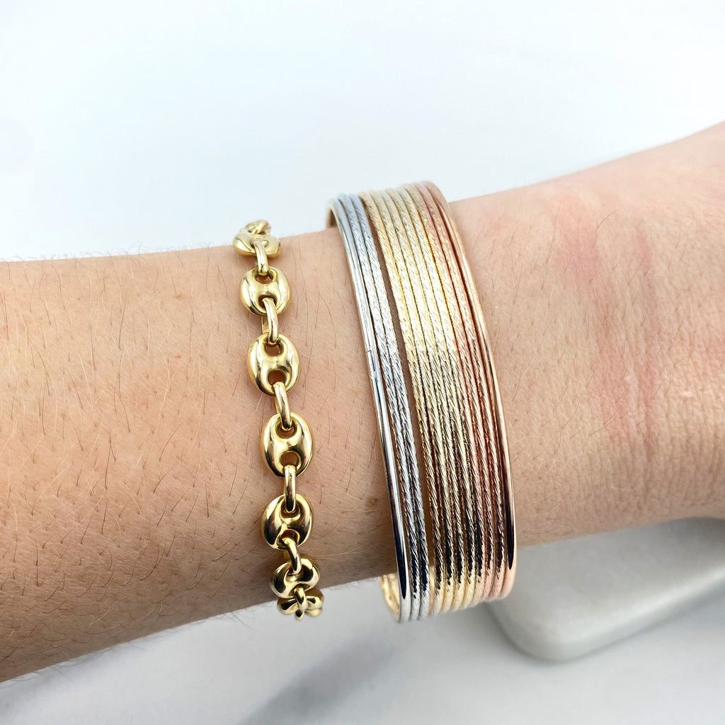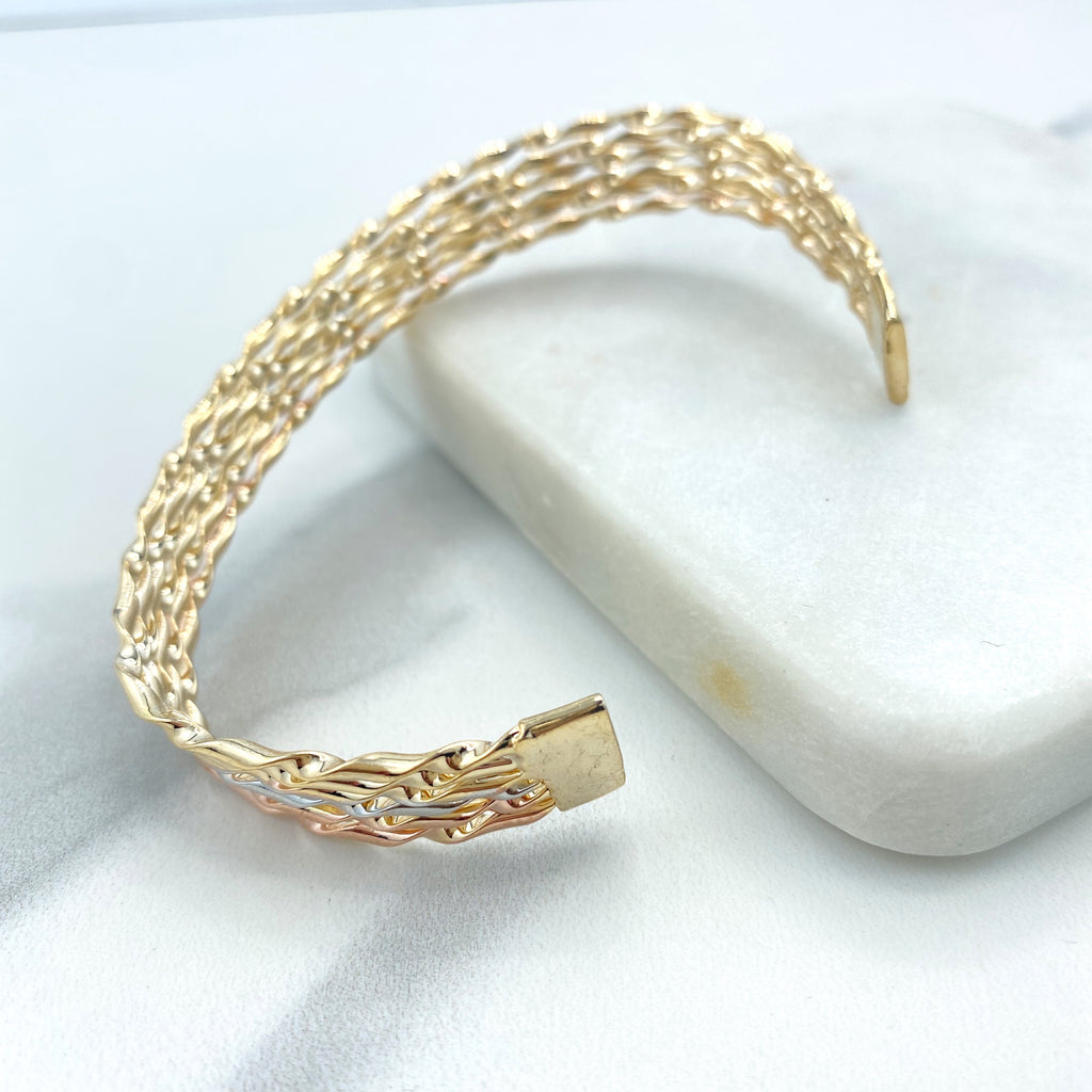 18k Gold Filled Tri-Tone Bangle, Lattice Pattern Bracelet, Elegant Statement Jewelry, Rose Gold Accents
