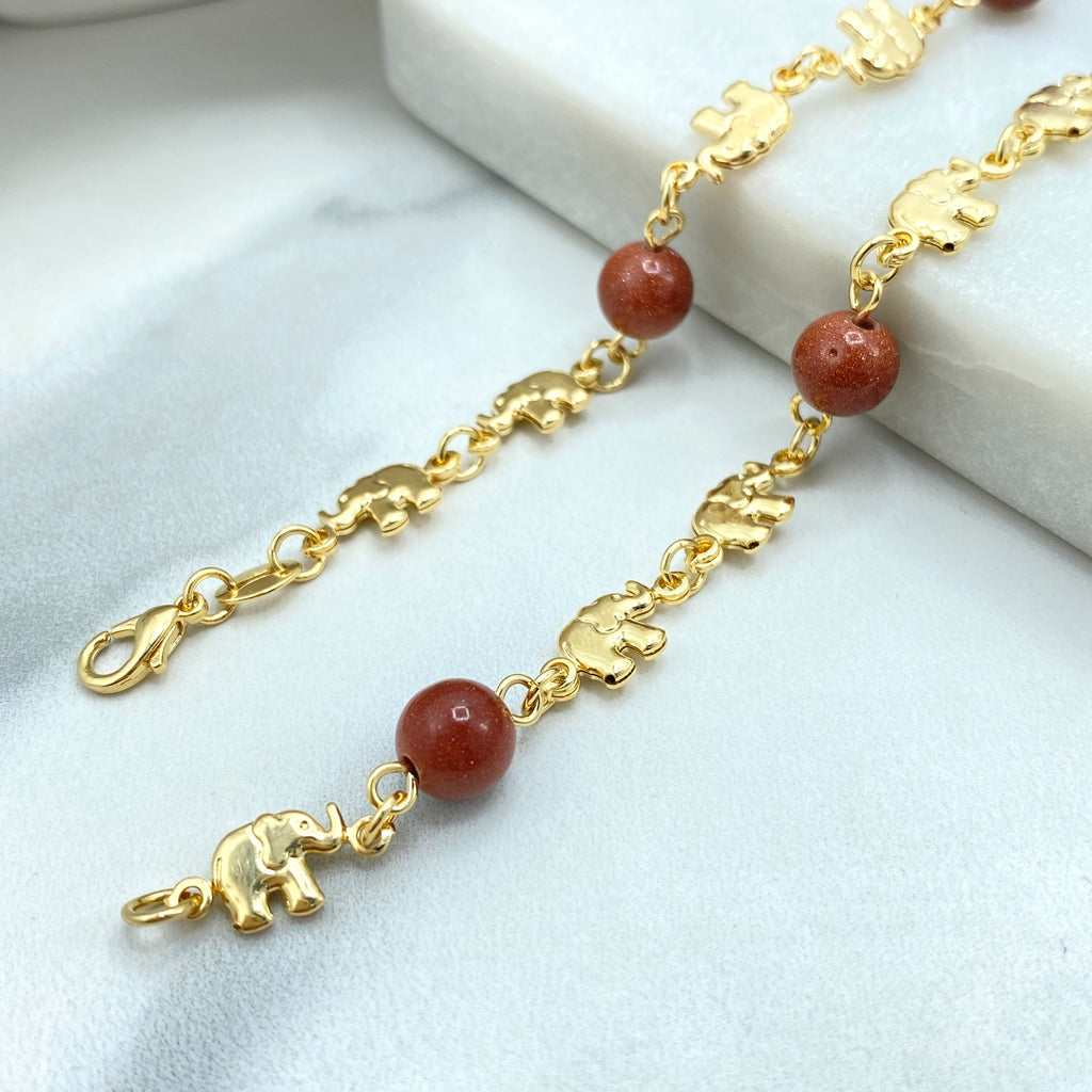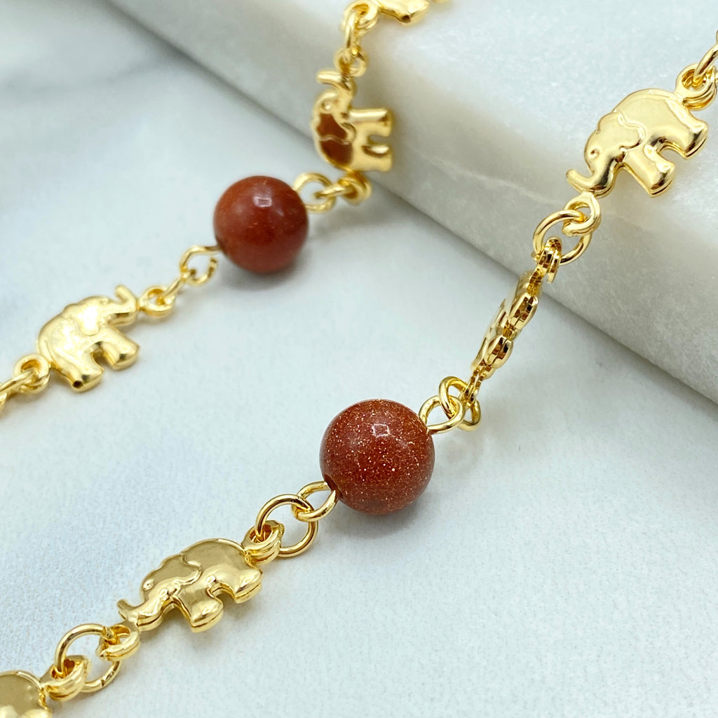 18k Gold Filled Aventurine & Puffed Elephants Necklace, 17.5 Inches Long, Elephants Charm with Aventurine Beads Necklace, Wholesale Jewelry.