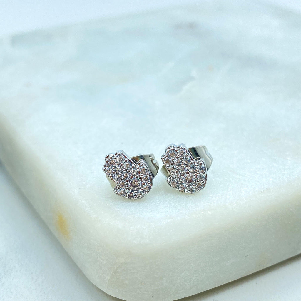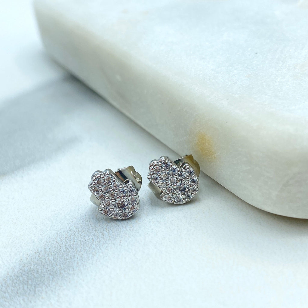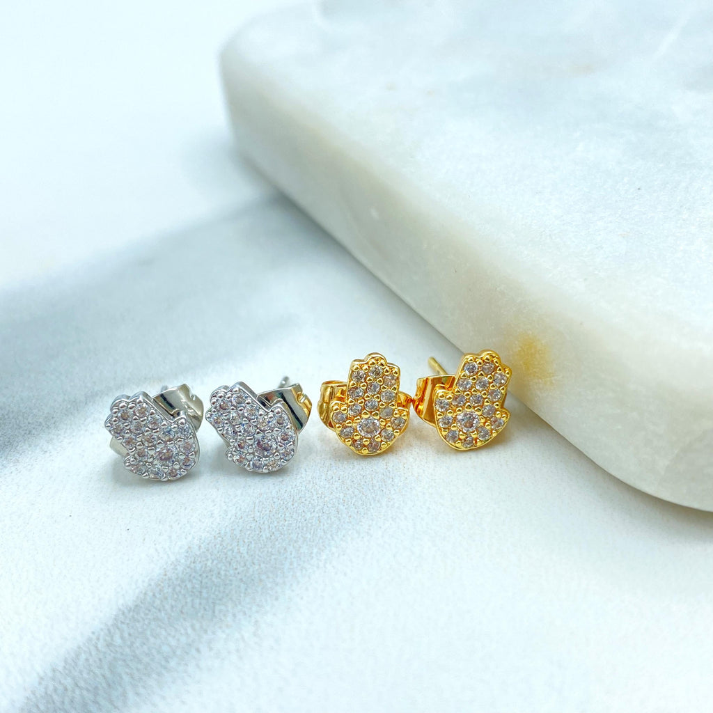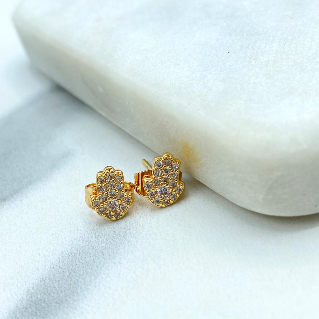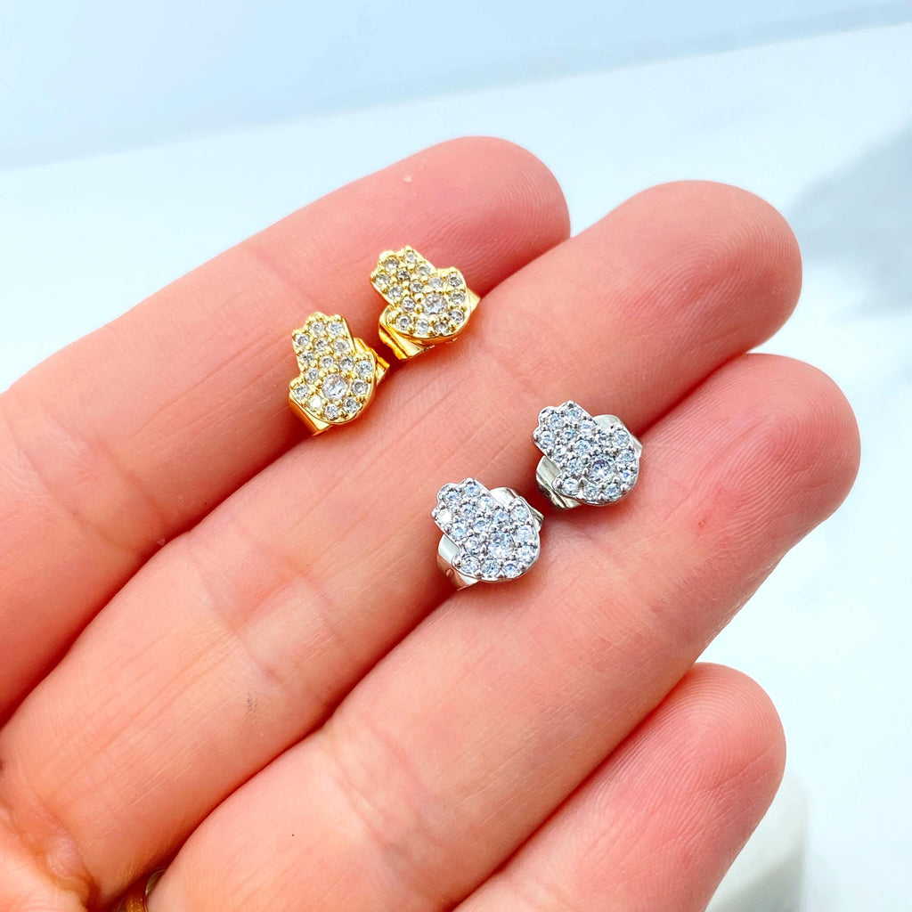 18k Gold Filled or Silver Filled Mini Hamsa Hand Stud with Micro Cubic Zirconia, Pave Hamsa Hand Shape Stud Earrings, Wholesale Jewelry.
